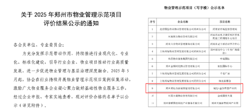 近日,鄭州市物業(yè)管理協(xié)會官網(wǎng)發(fā)布《關(guān)于2025年鄭州市物業(yè)管理示范項(xiàng)目評價結(jié)果公示的通知》,城發(fā)·金岱智慧產(chǎn)業(yè)園獲評“鄭州市物業(yè)管理示范項(xiàng)目”。